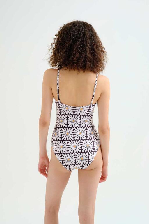 Bañador con estampado olive flower black. Escote recto y tirantes ajustables. Espalda baja. Forro interior. La modelo mide 173 cm y lleva la talla S.