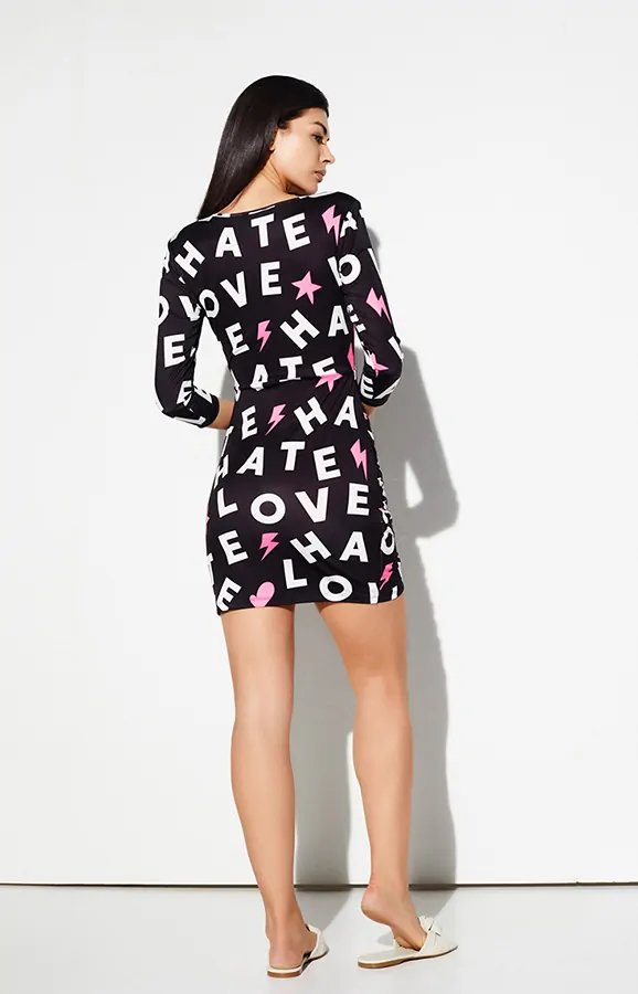 Vestido con escote redondo y hombreras. Manga francesa. Falda efecto cruzado.