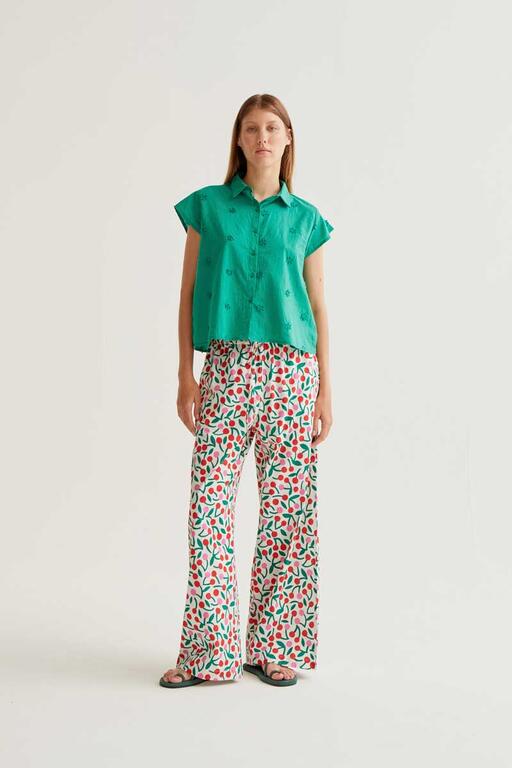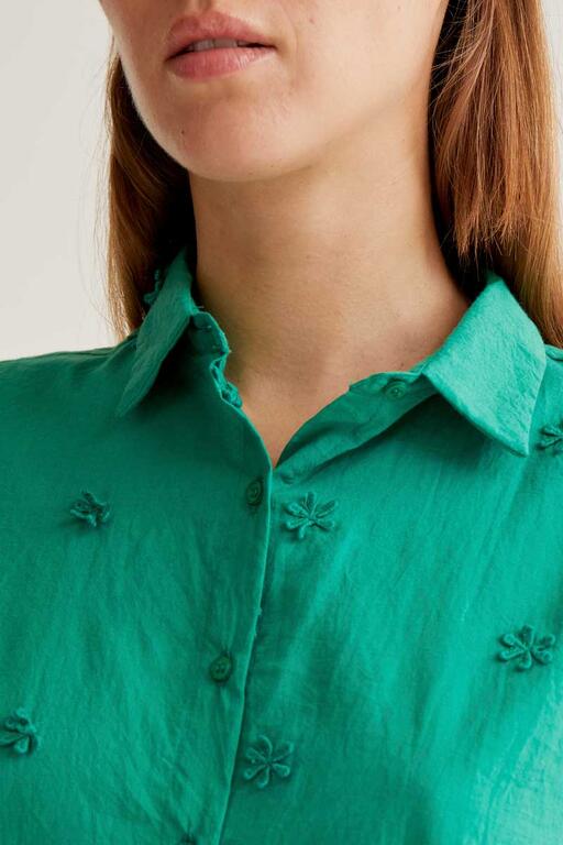 Camisa con tejido 100% algodón de color verde. Cuello solapa y manga corta. Cierre frontal con botones de color verde. Detalle de flores bordadas. La modelo mide 177 cm y lleva la talla S.