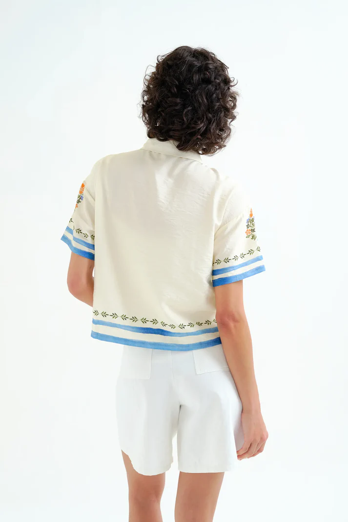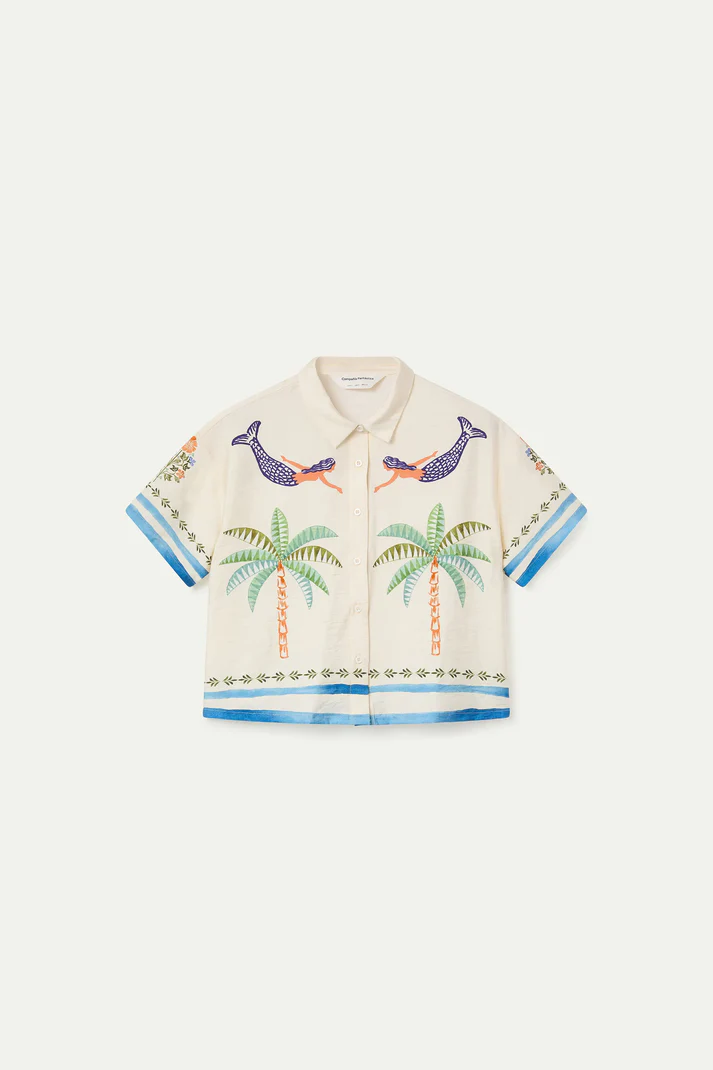 Camisa de tejido crepé con estampado palm & mermaid. Cuello con solapa y manga corta. Hombro ligeramente caído. Cierre frontal con botones de color blanco. La modelo mide 175 cm y lleva la talla S.