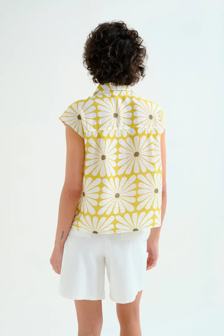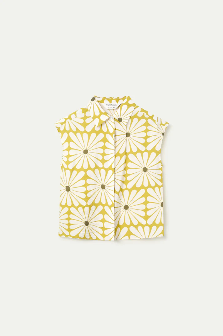 Camisa de tejido crepé con estampado olive flower. Cuello solapa y sin mangas. Cierre frontal con botones ocultos. La modelo mide 175 cm y lleva la talla S.