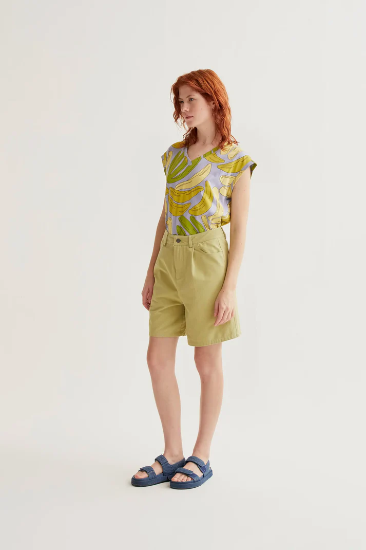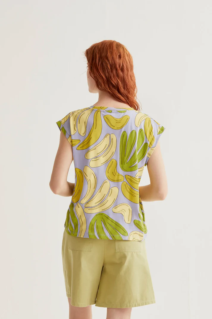 Camiseta de tejido 100% algodón con estampado guineo. Cuello redondo y manga corta. La modelo mide 175 cm y lleva la talla S.