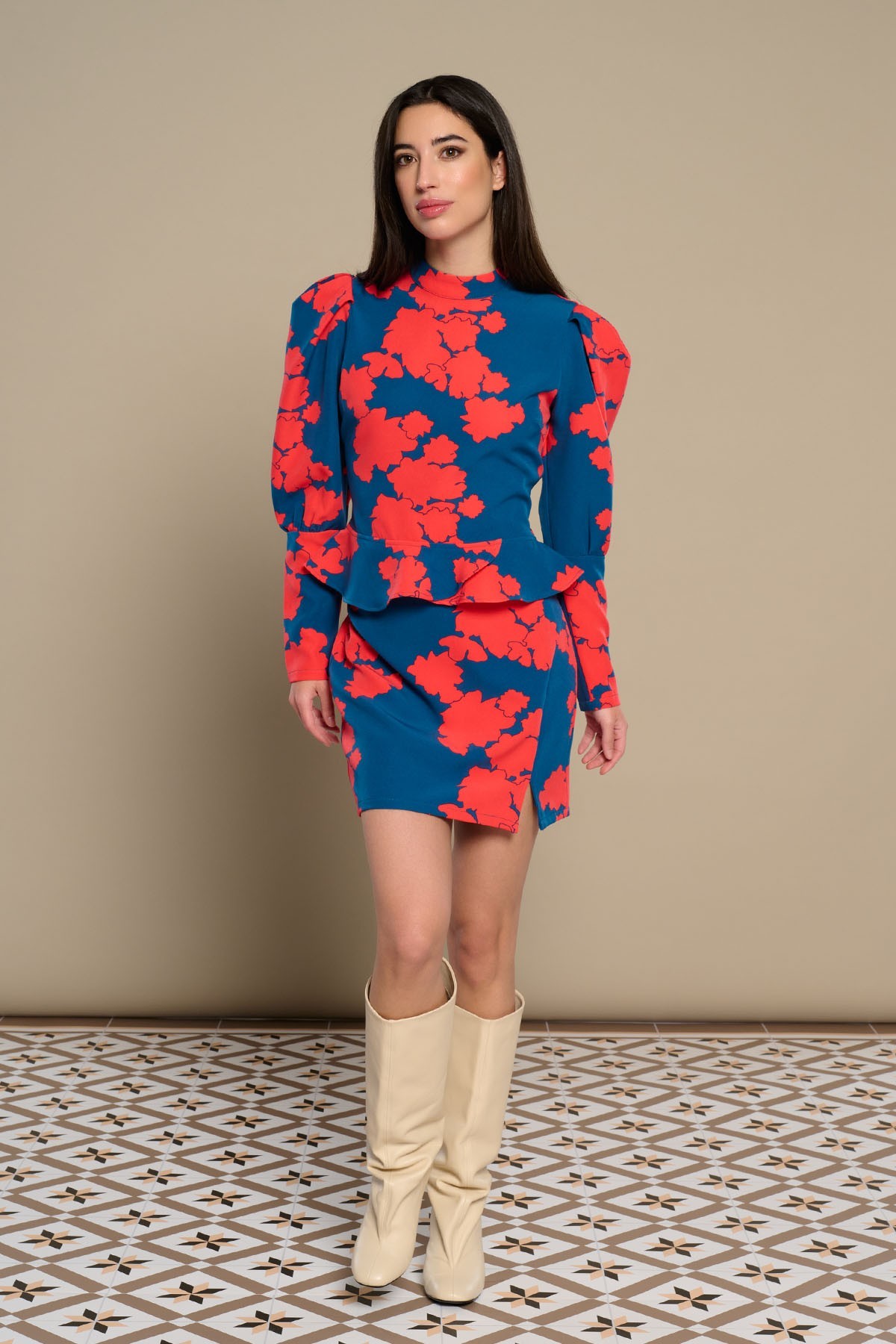 Top con cuello redondo y manga larga abullonada acabada en puño. Peplum en cintura.