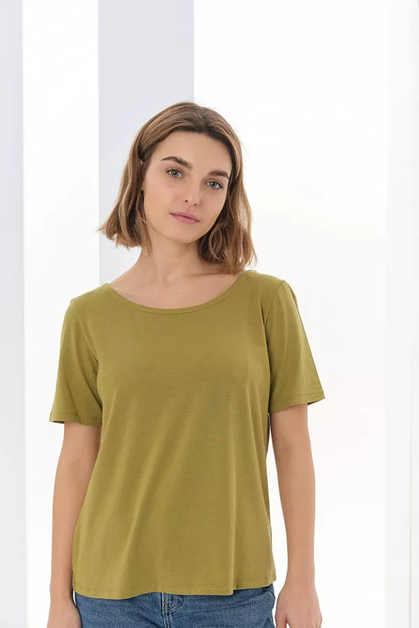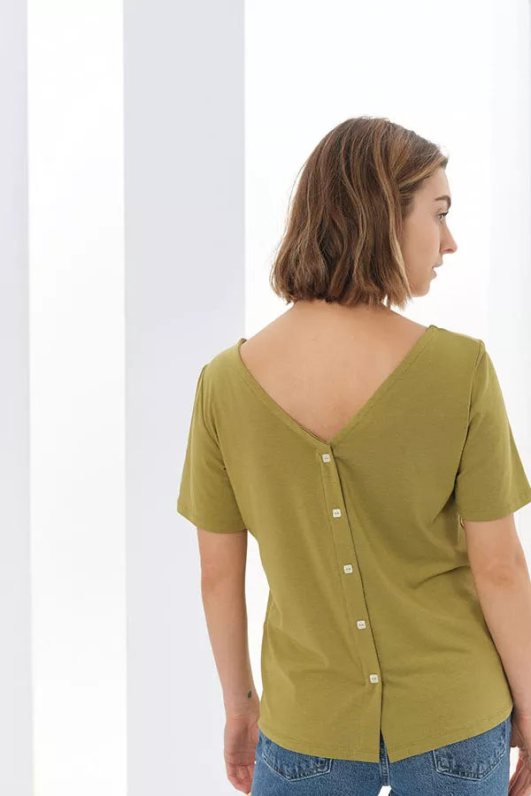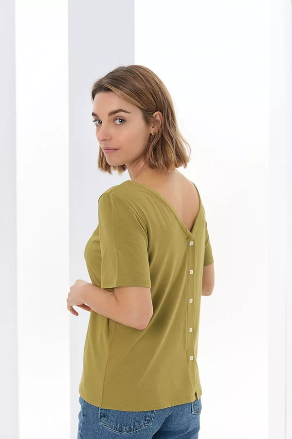 Camiseta de manga corta con escote trasero en V y botones cuadrados. La modelo lleva la talla S.