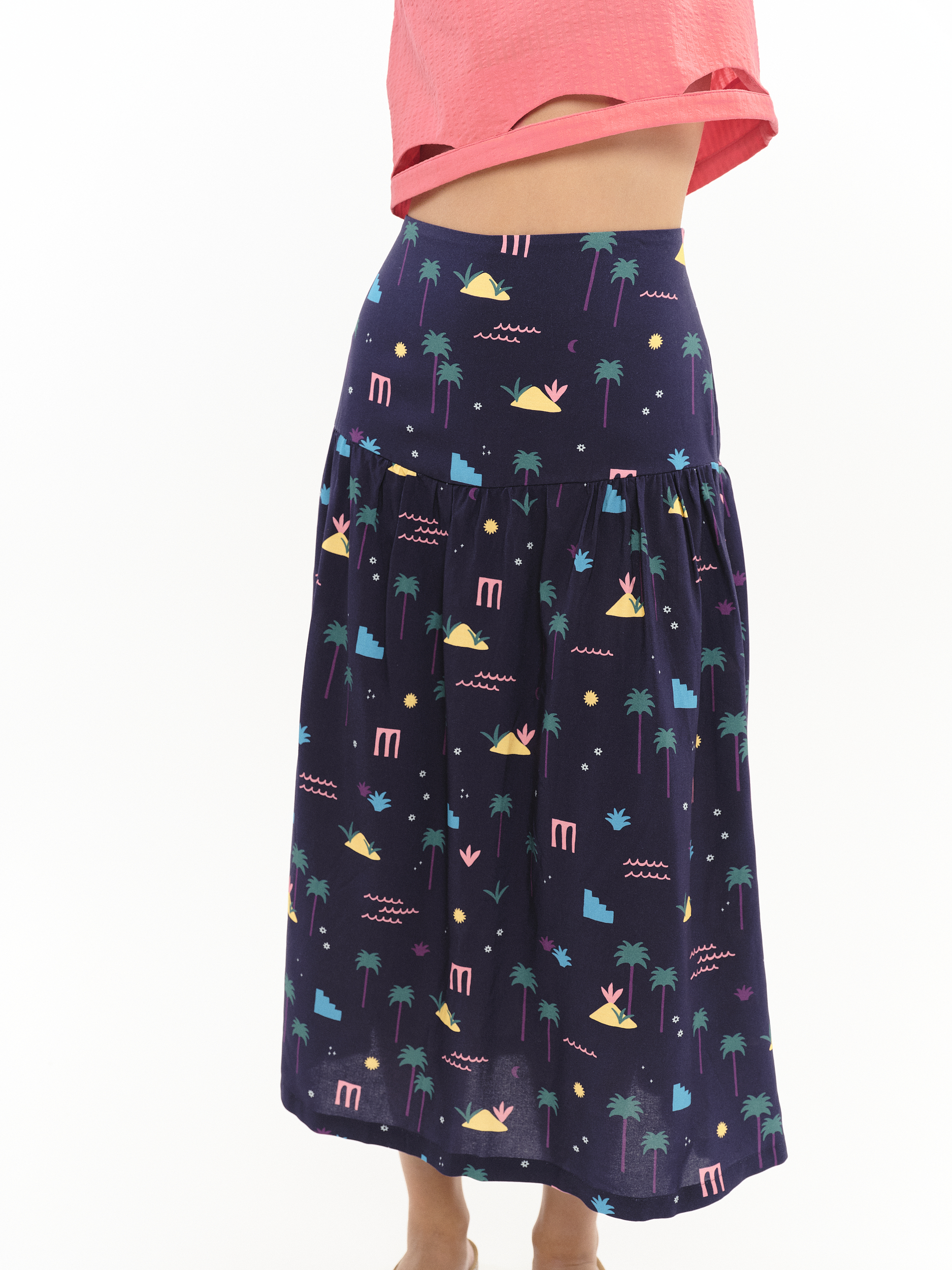 Falda de talle alto estilo fajín de largo midi. La modelo lleva la talla S