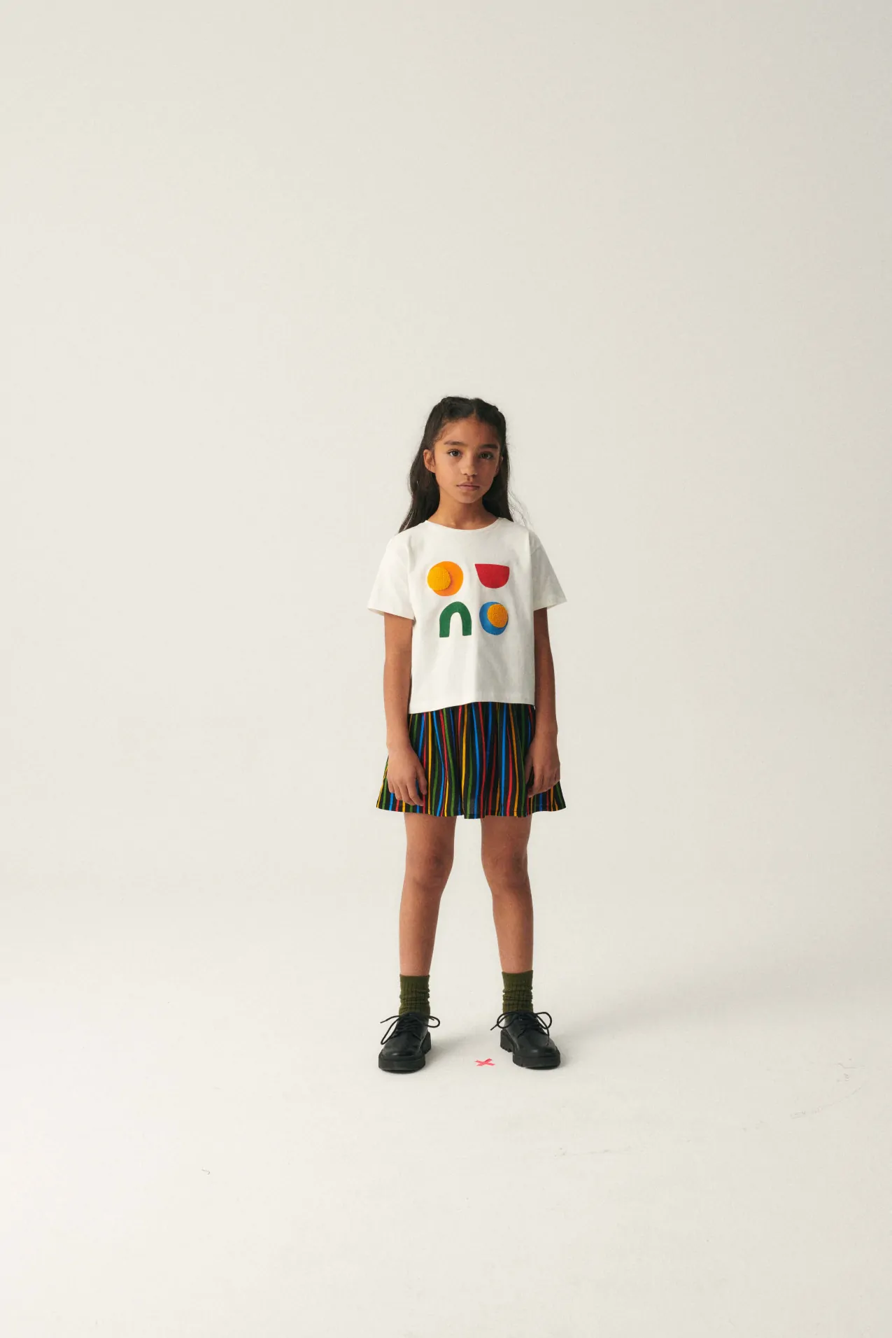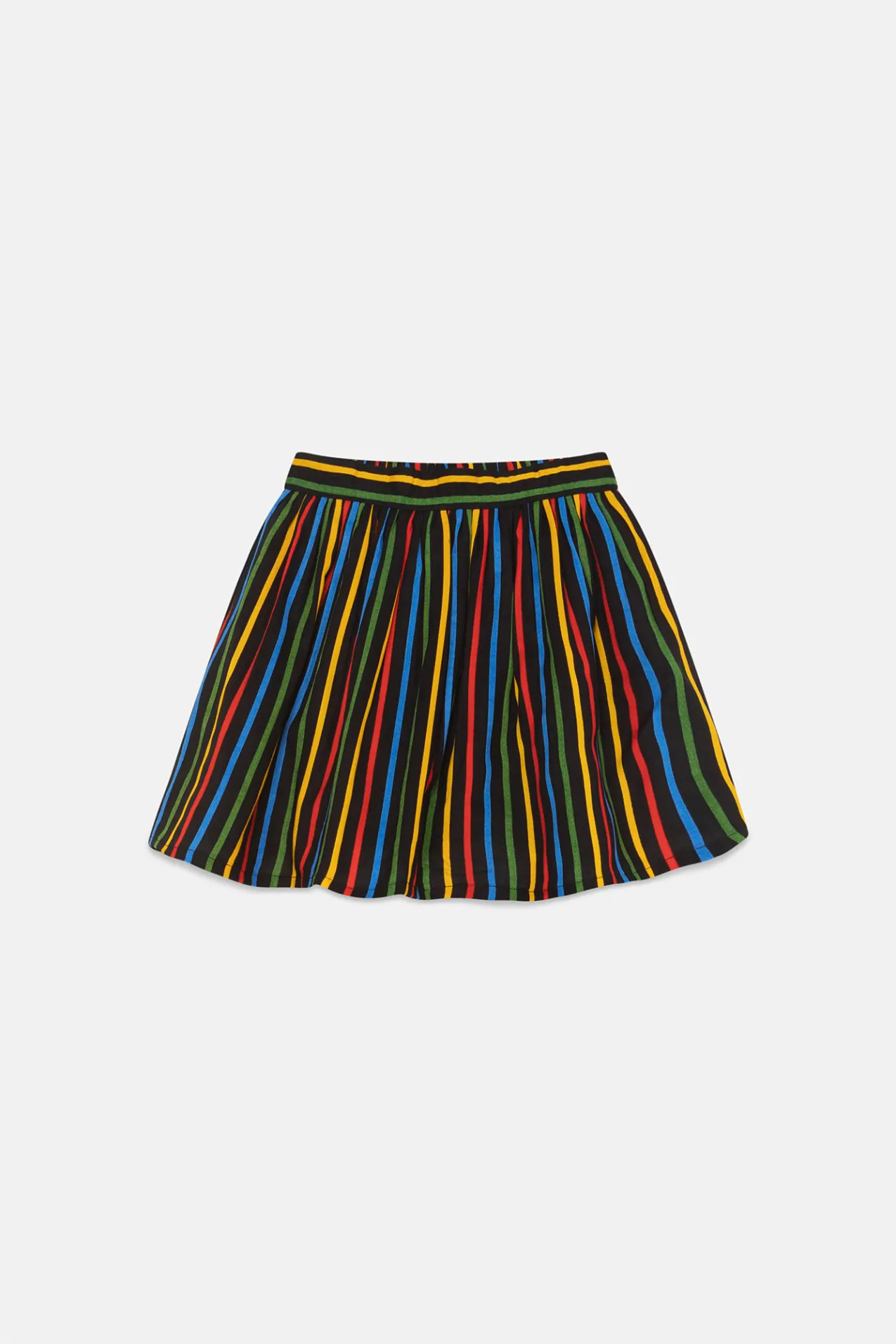 Minifalda de niña con estampado de rayas multicolor. Con cintura elástica de tiro medio. Forro interior.