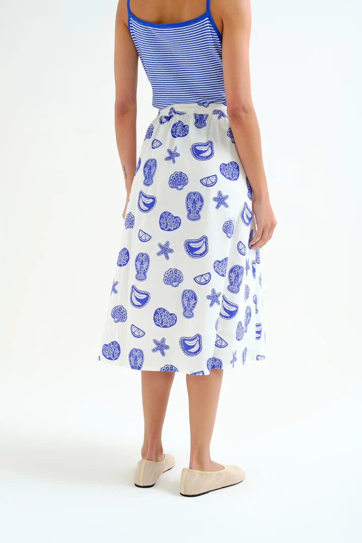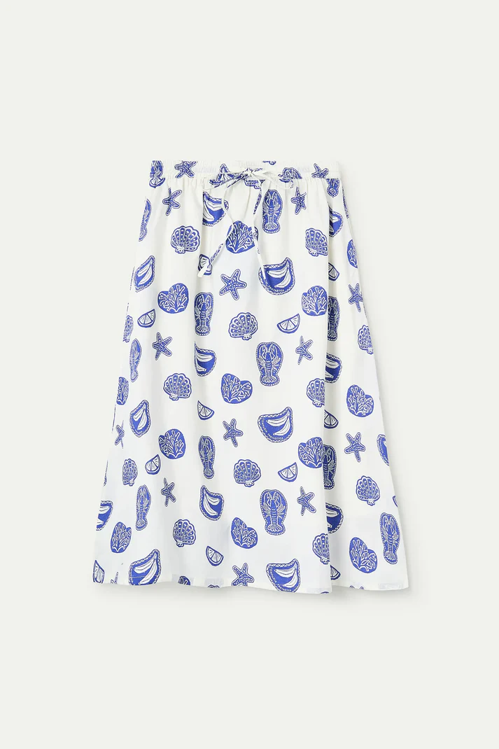Falda de tejido 100% algodón con estampado lobster. Cintura elástica con cordones ajustables. Bolsillo lateral. Forro interior. La modelo mide 175 cm y lleva la talla S.