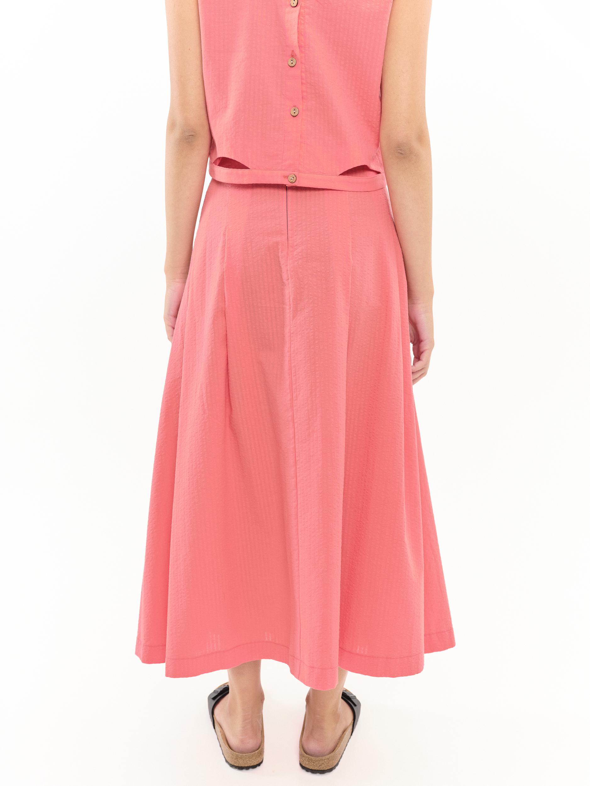 Falda al tobillo de tejido de algodón con tablas y bolsillo laterales integrados. La modelo lleva la talla S.