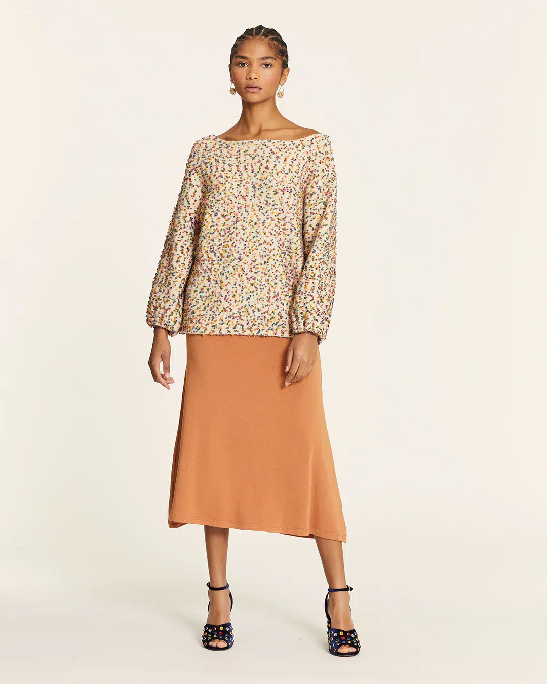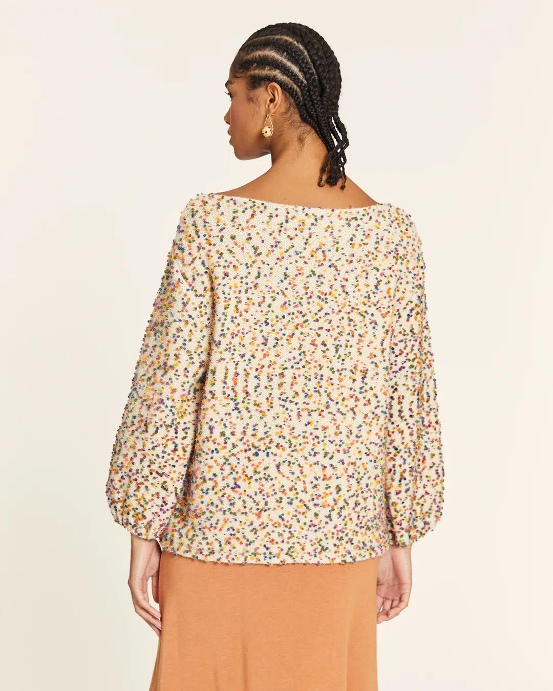 Jersey mini pompón crema, cuello barco, manga bishop,puño shirred, a la altura de la cintura.
