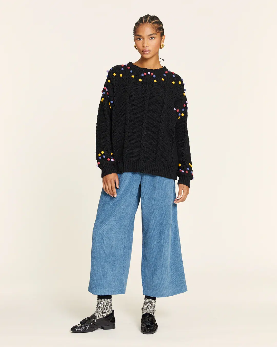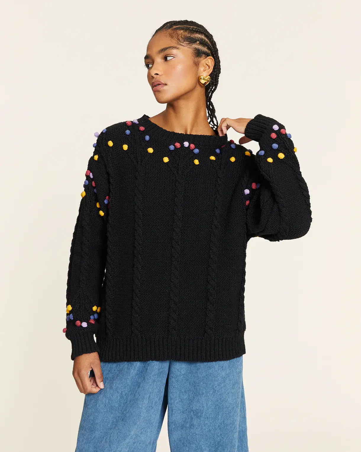 Jersey pompon con trenzados negro, cuello redondo, manga bishop, puño shirred, a la altura de la cintura.