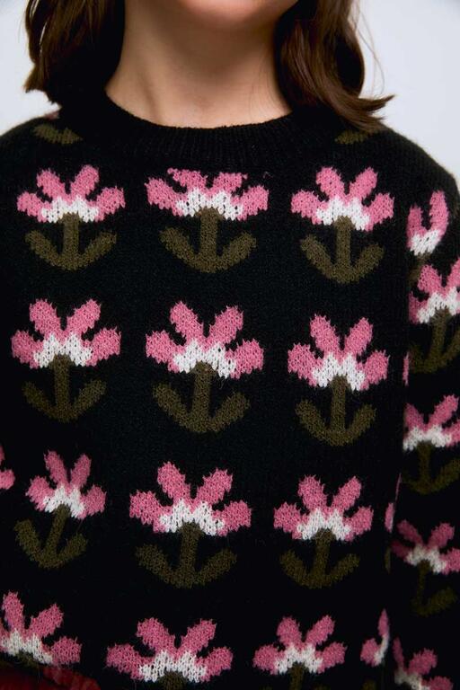 Jersey de niña de punto con estampado de flores Baboushka. Corte recto, cuello redondo y puños ajustados.