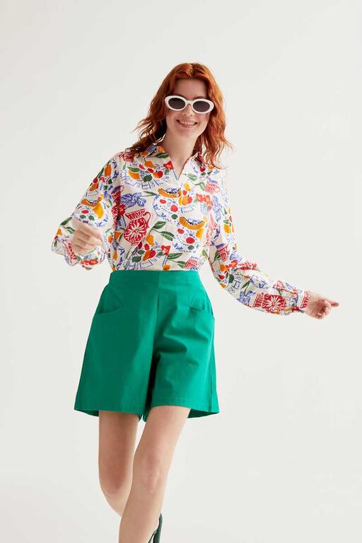 Shorts de tejido 100% algodón de color verde. Cintura elástica de tiro alto. Bolsillo lateral. La modelo mide 175 cm y lleva la talla S.