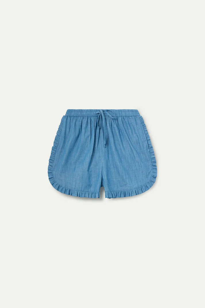 Shorts con tejido 100% algodón chambray de color azul claro. Cintura elástica de tiro alto con cordones ajustables. Bolsillos laterales. Detalles de volantes. La modelo mide 175 cm y lleva la talla S.