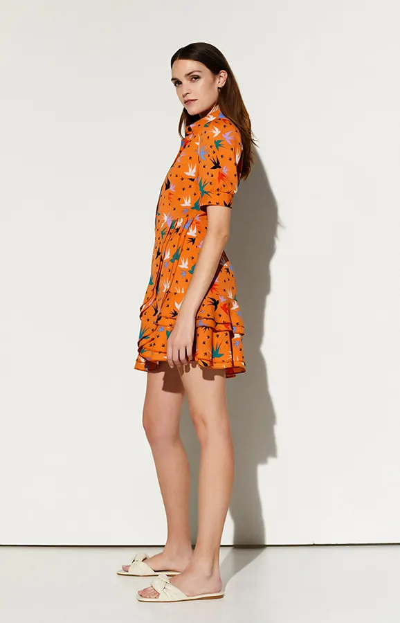 Vestido camisero de manga corta. Falda con volantes. Cierre delantero con botones y cremallera lateral.