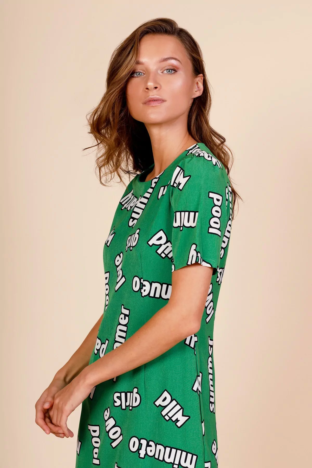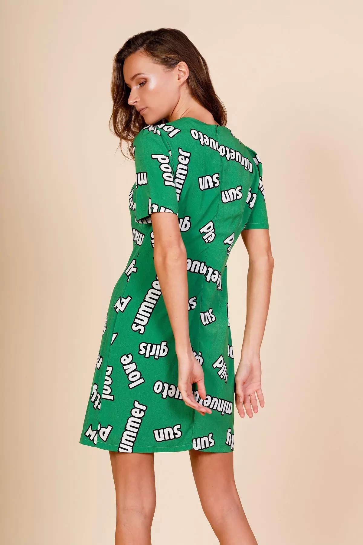 Vestido entallado color verde con letras en blanco.