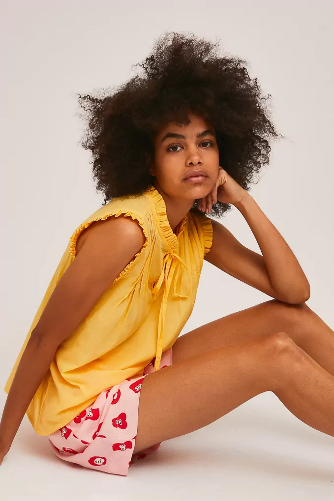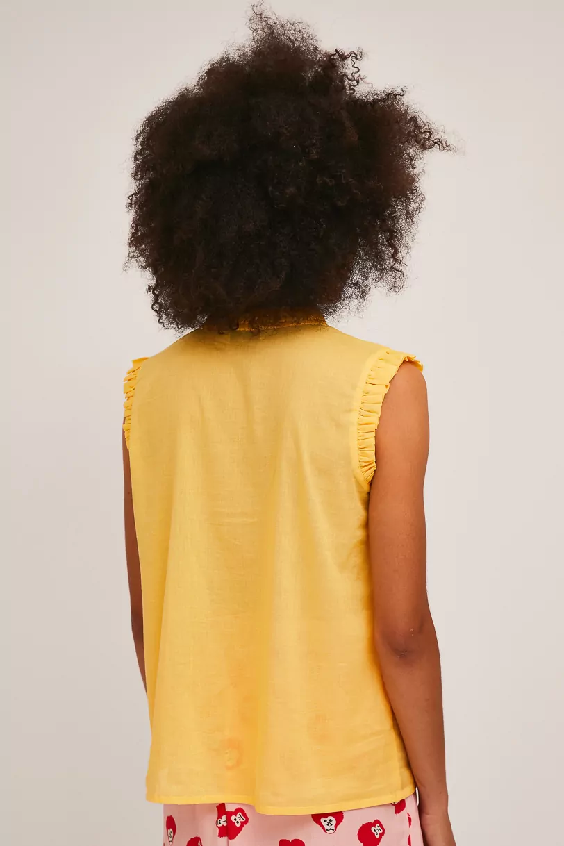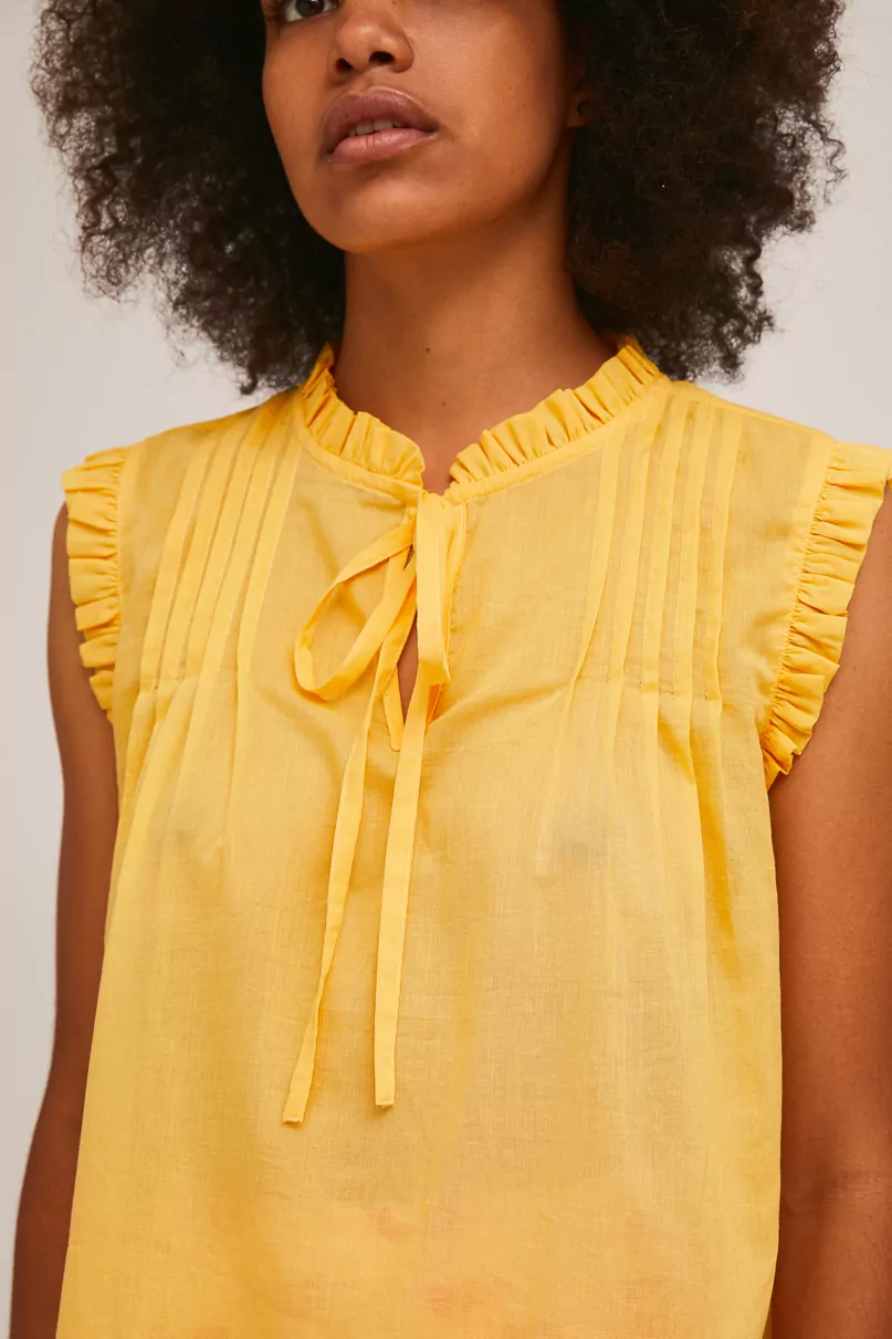 Top amarillo desmangado con lazada en el cuello