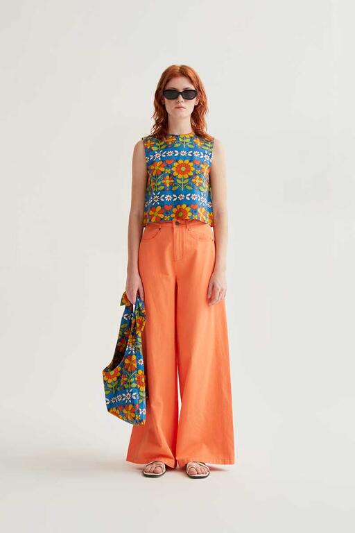 Top de tejido 100% algodón con estampado garden. Cuello redondo y sin mangas. Cierre posterior con botón oculto. La modelo mide 175 cm y lleva la talla S.