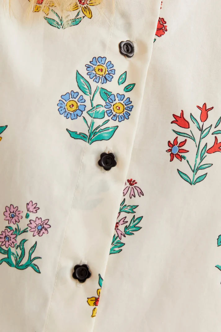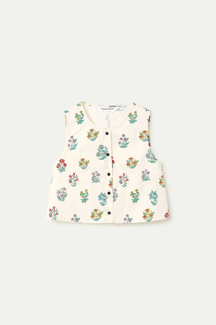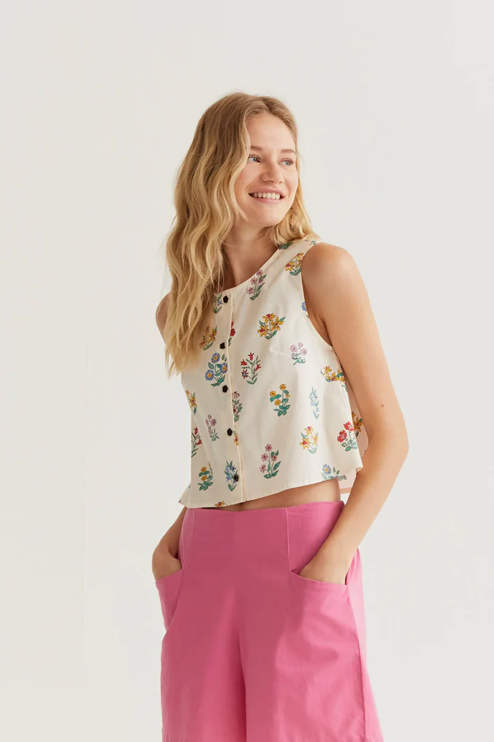 Top de tejido 100% algodón con estampado gardener. Cuello redondo y sin mangas. Cierre frontal con botones decorativos en forma de flor. La modelo mide 177 cm y lleva la talla S.