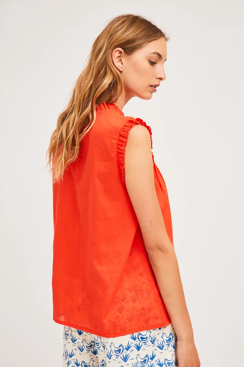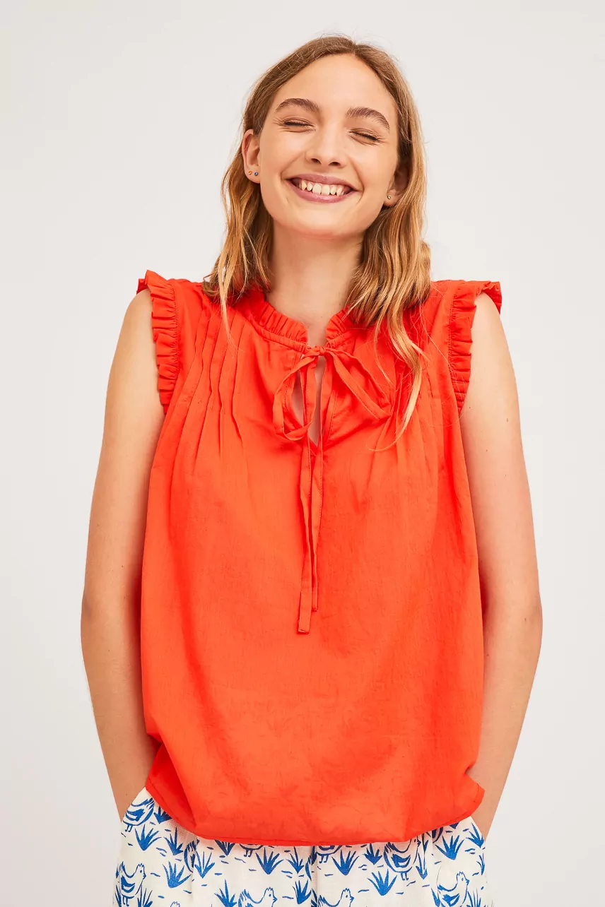 Top desmangado color naranja con lazada en el cuello.