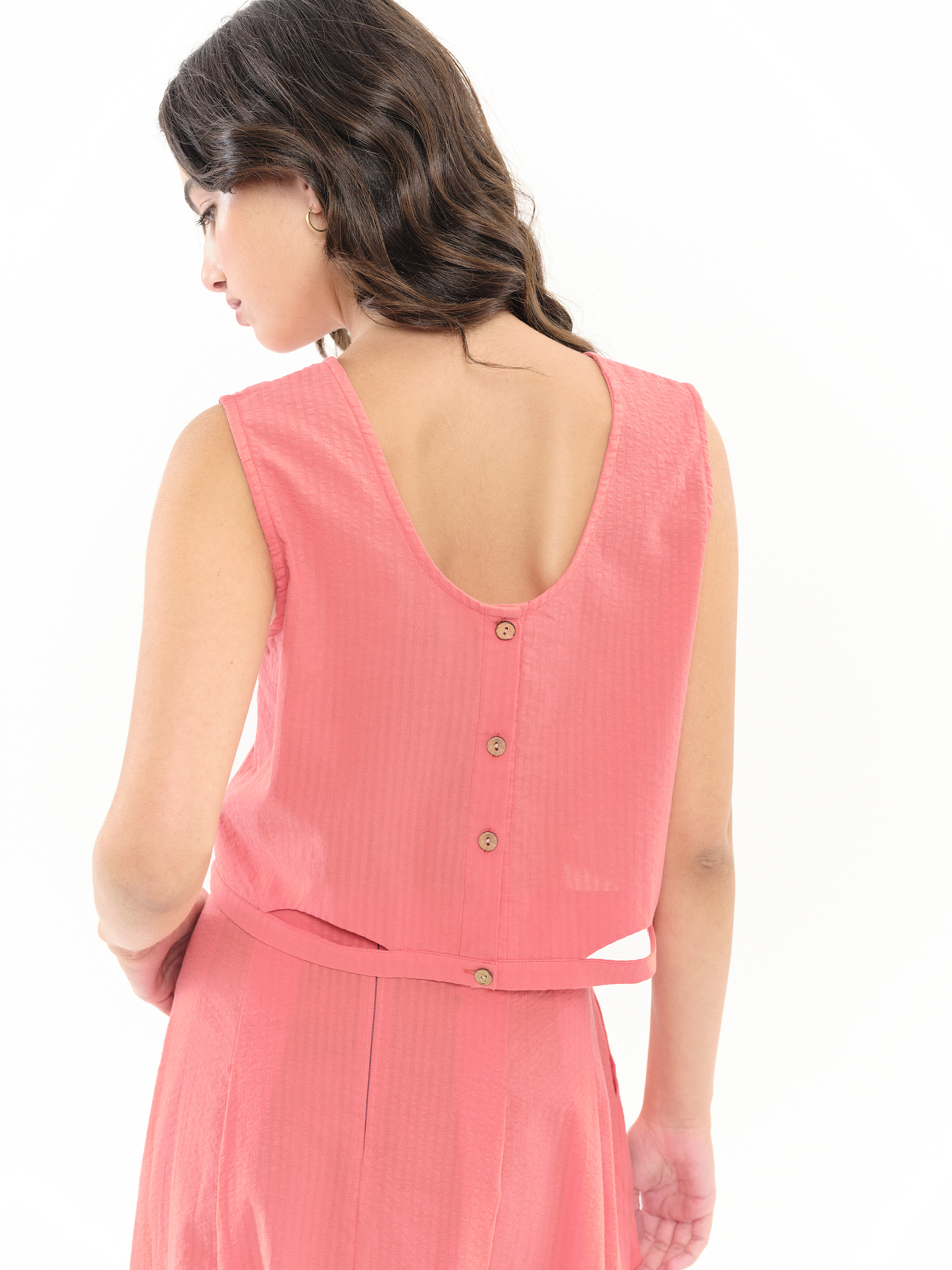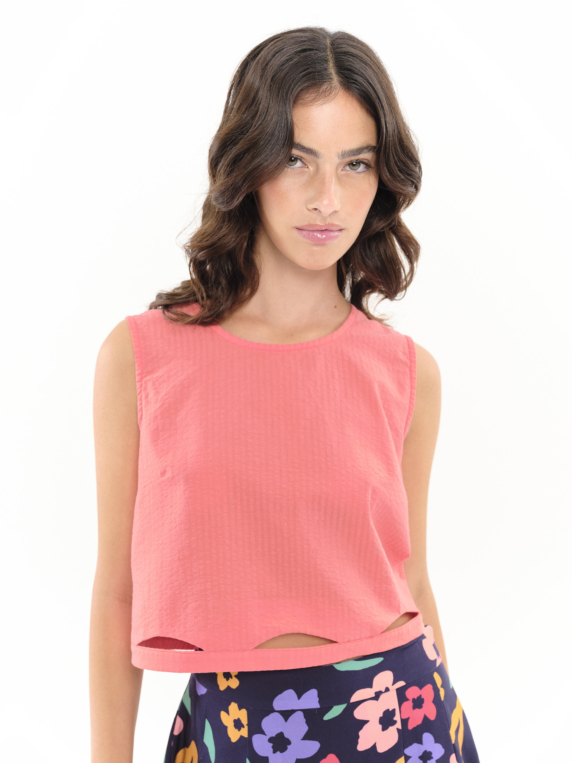 Top de algodón con cut outs en forma de onda. Espalda escotada con botones. La modelo lleva una S