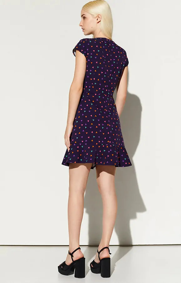 Vestido con cuello redondo. Manga corta. Falda con volantes. Detalle de botones falsos. Cierre con cremallera trasera.