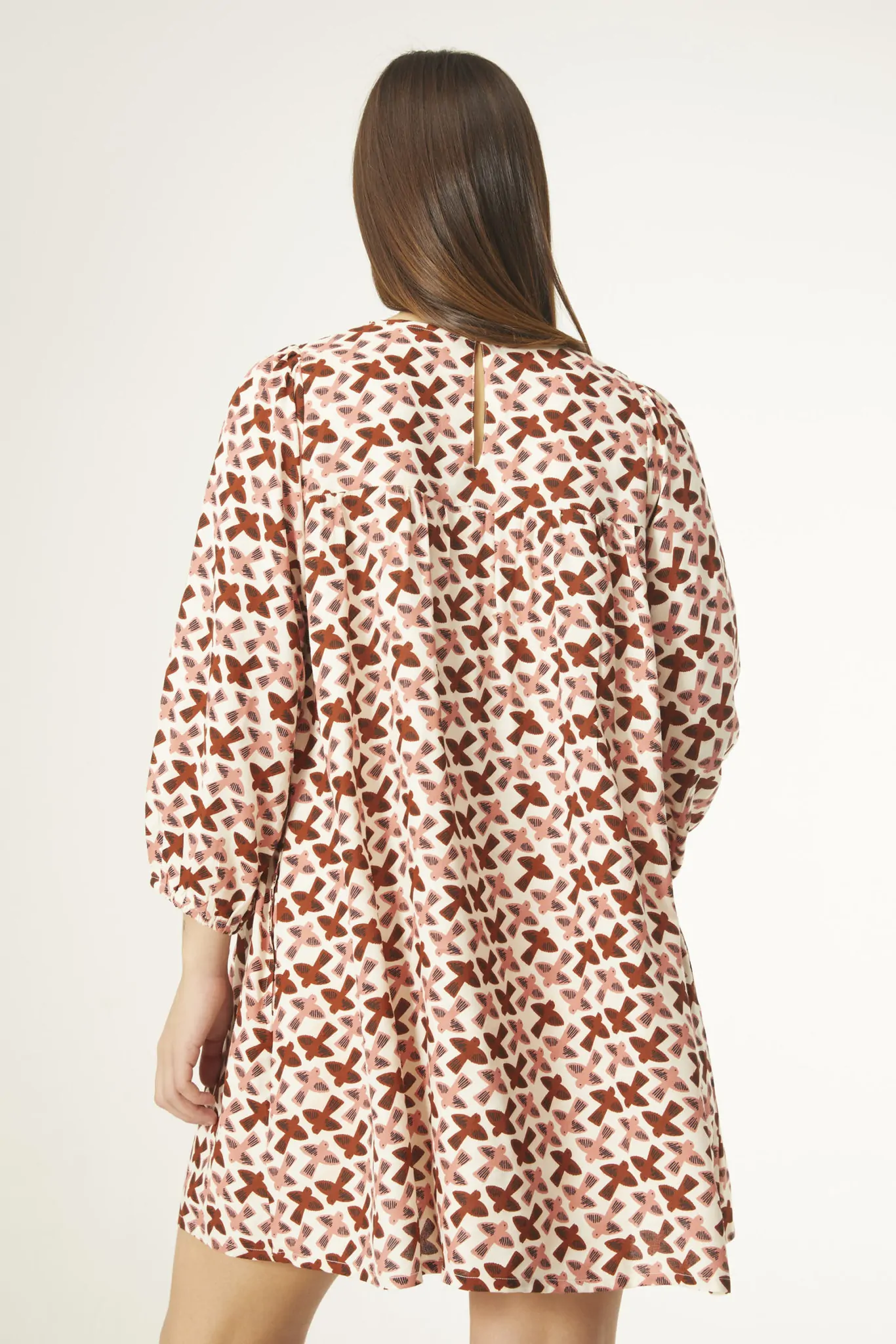 Vestido corto amplio con detalle de nido de abeja y animal print de pájaros.