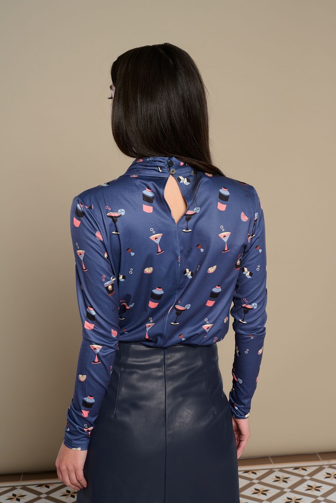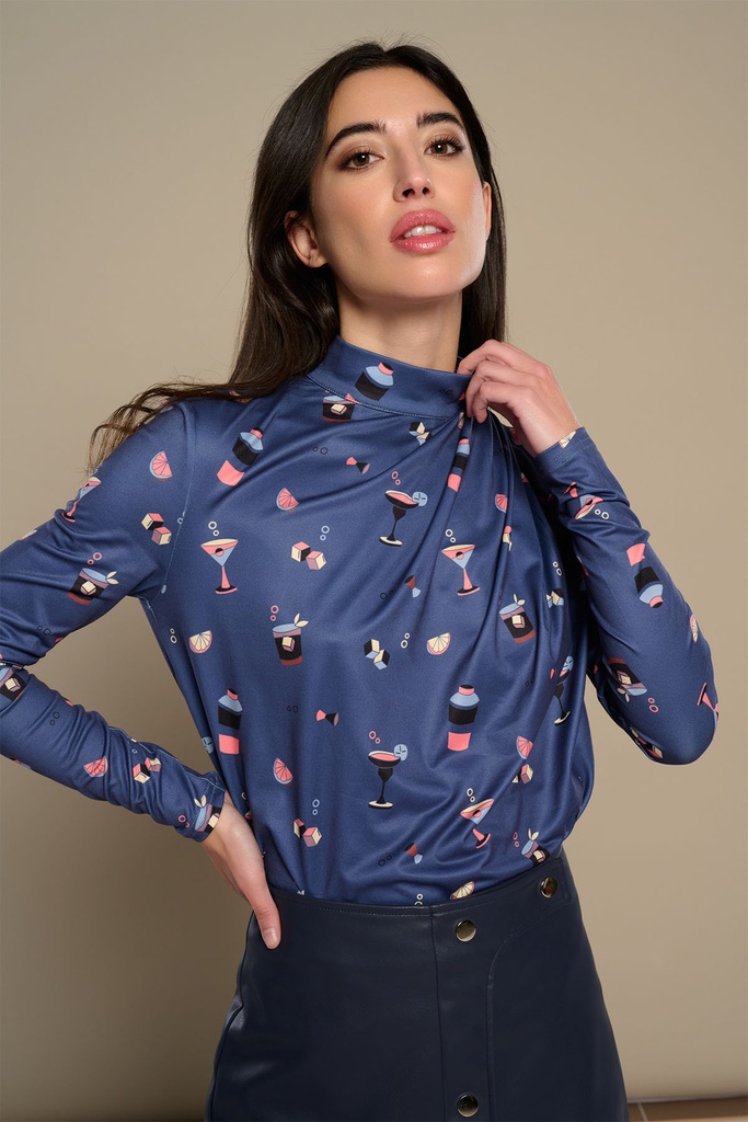 Camiseta de cuello perkins y manga larga. Tejido elástico térmico. Estampado coctel en azul.