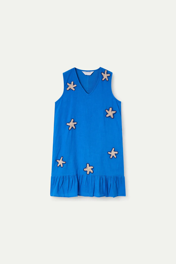 Vestido de tejido 100% algodón de color azul marino con apliques de estrellas bordadas. Escote pico y sin mangas. Detalle de volantes en falda.Forro interior. La modelo mide 175 cm y lleva la talla S.