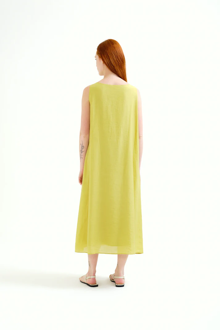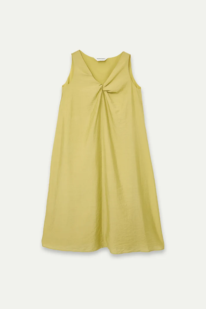 Vestido largo de tejido crepé satinado de color verde. Escote redondo y sin mangas. Detalle anudado en el pecho. Forro interior. La modelo mide 175 cm y lleva la talla S.