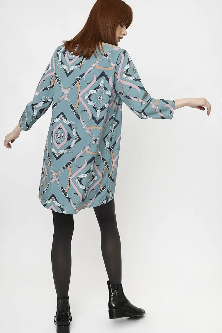 Vestido estampado cadenas. Cuello redondo y botón en la parte trasera.