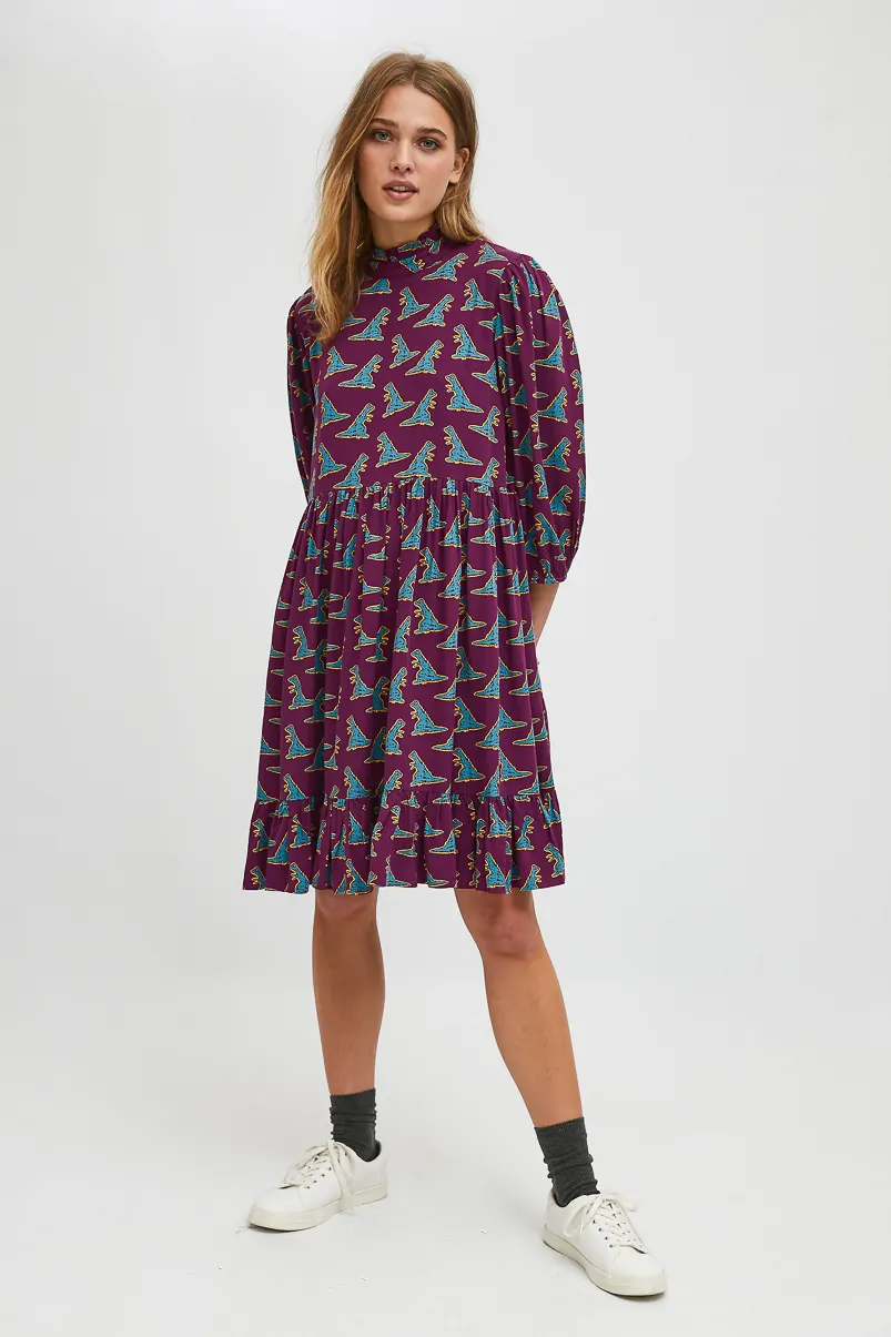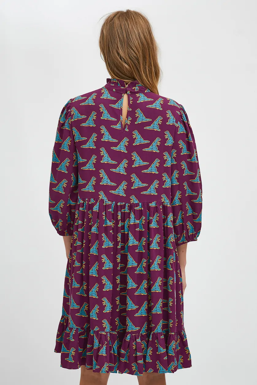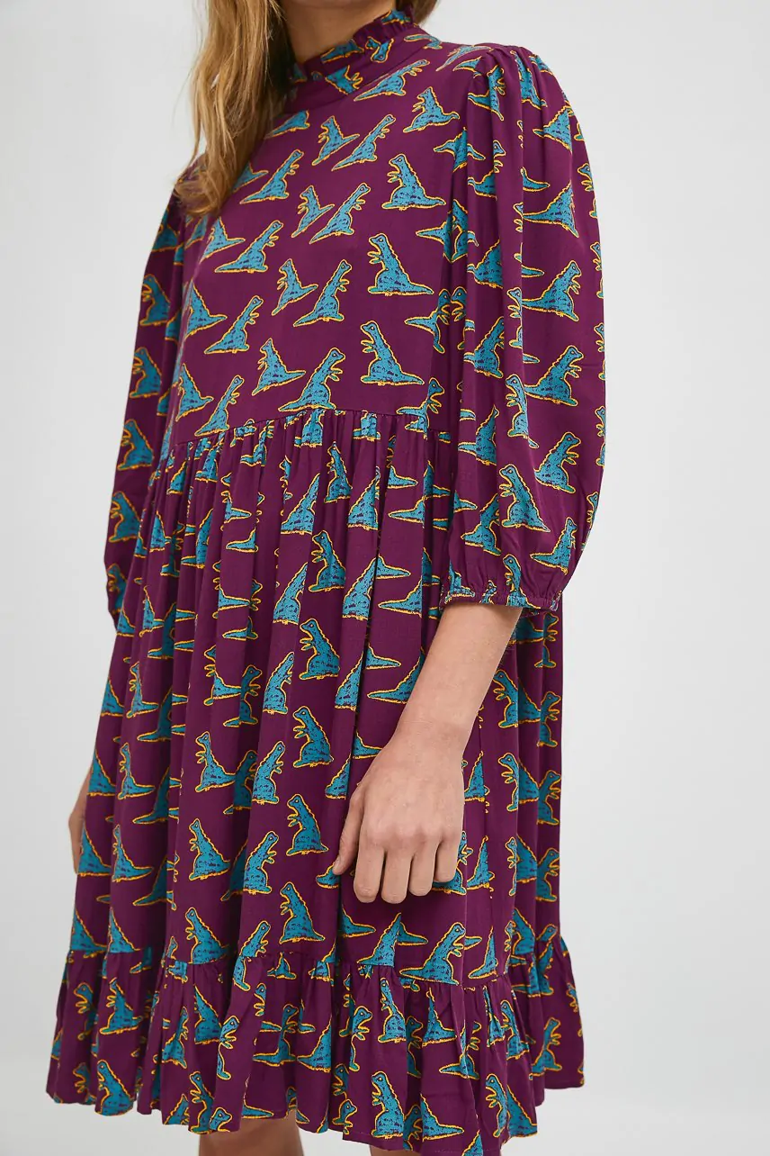 Vestido color morado con estampado de dinosaurios
