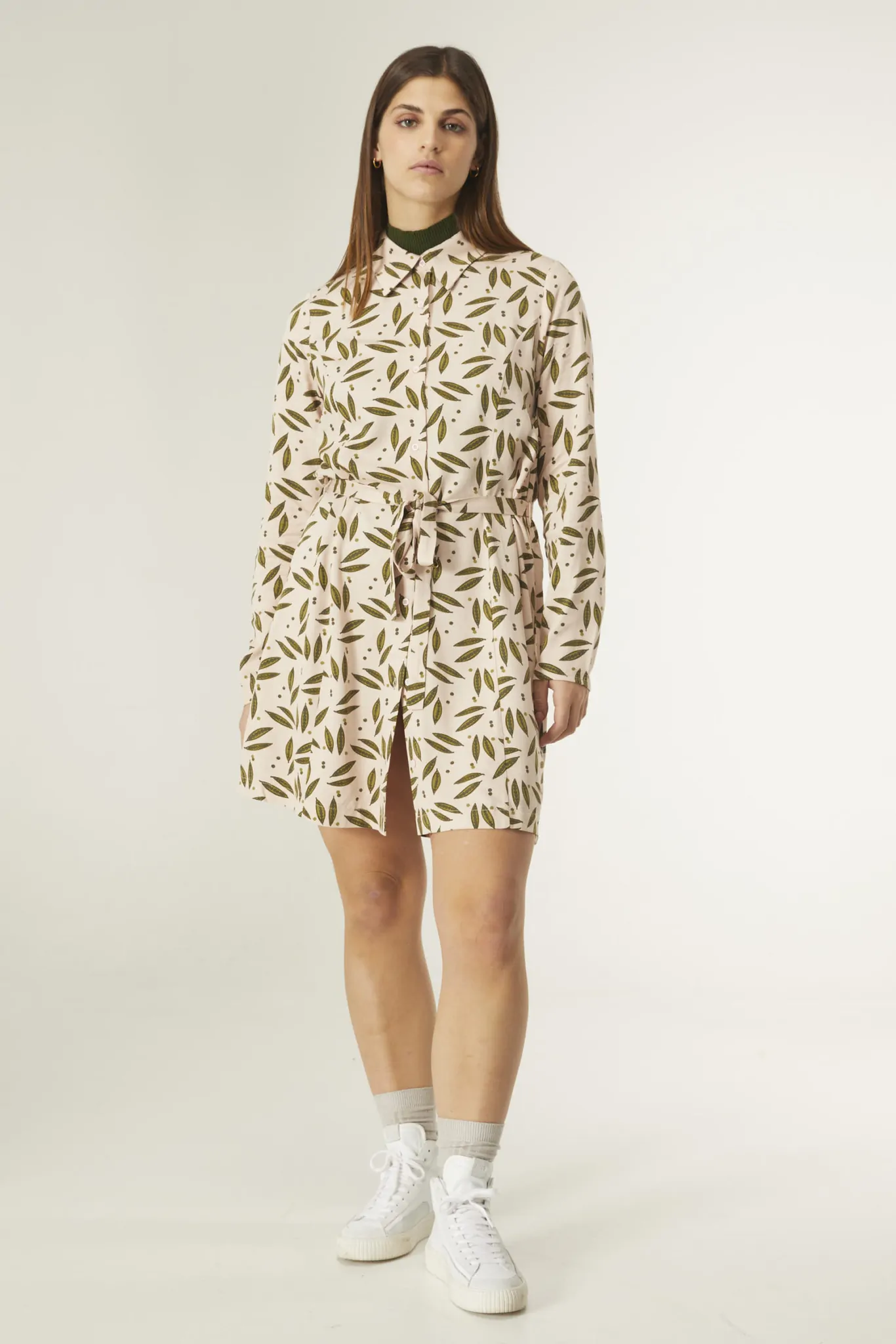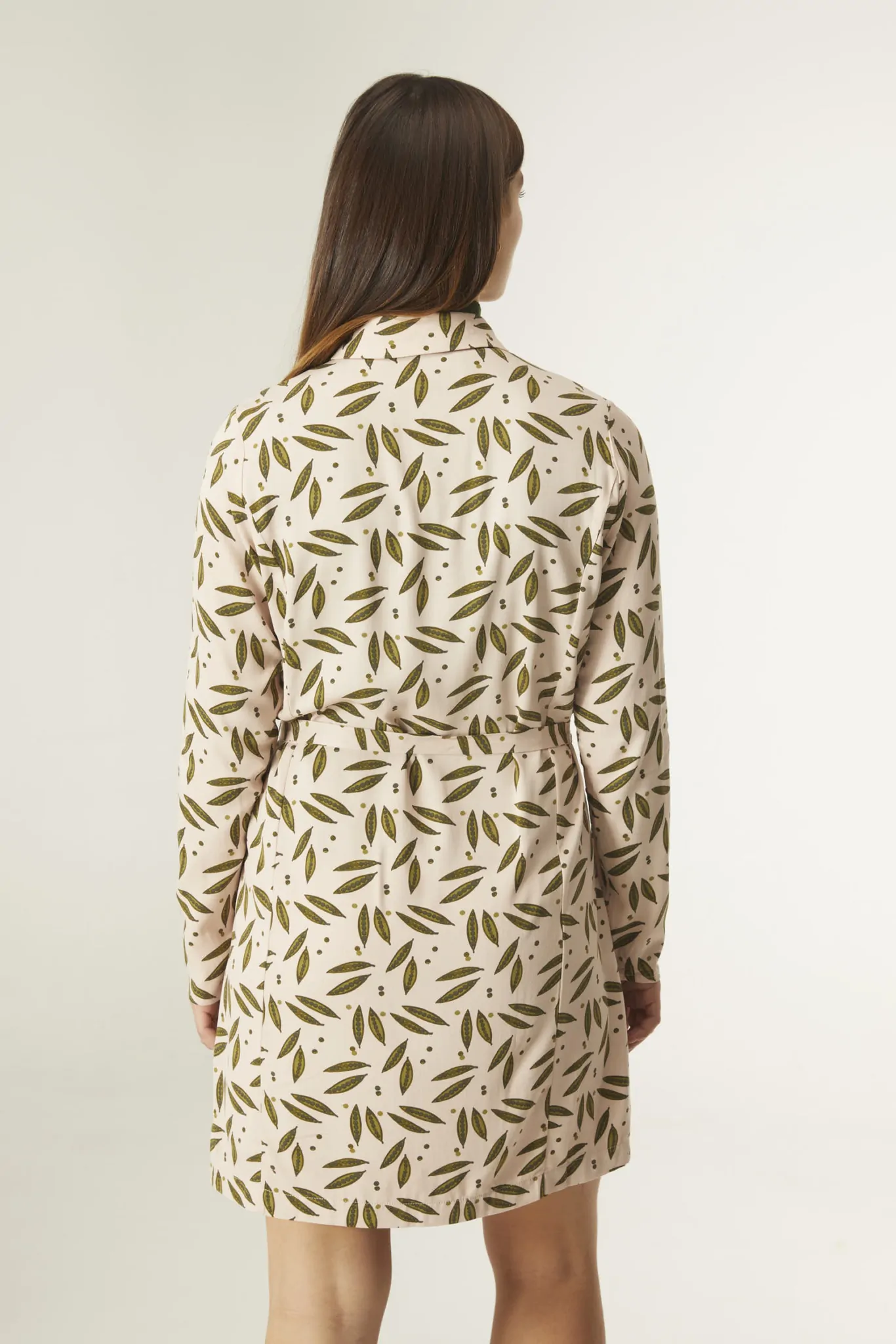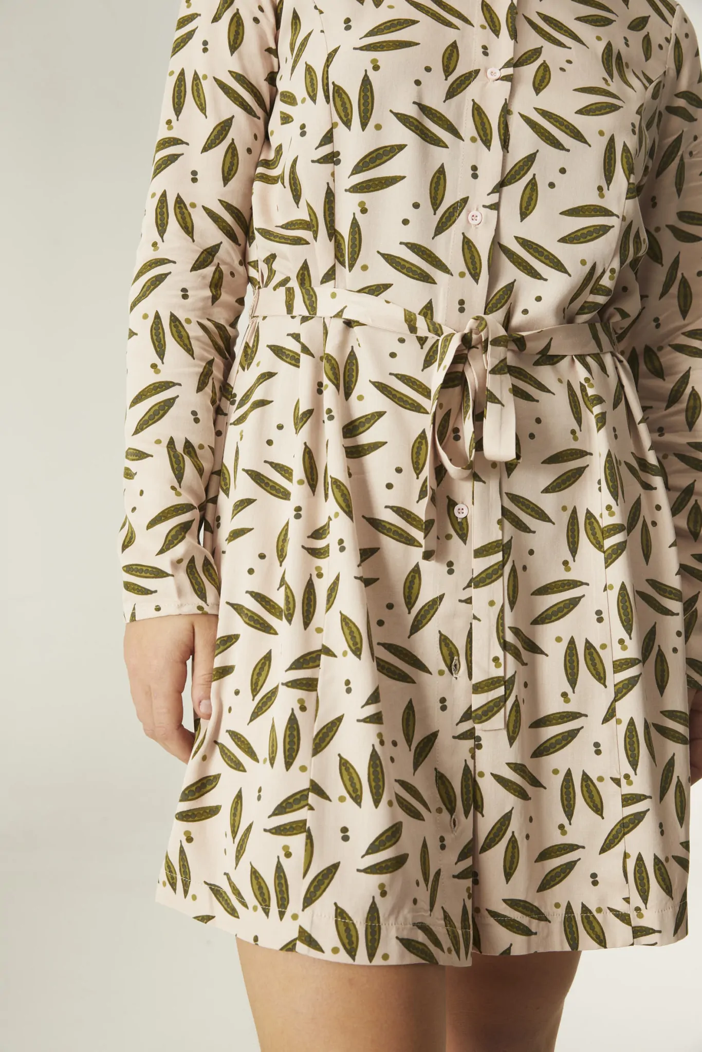 Vestido corto evasé con cuello camisero y estampado de guisantes.