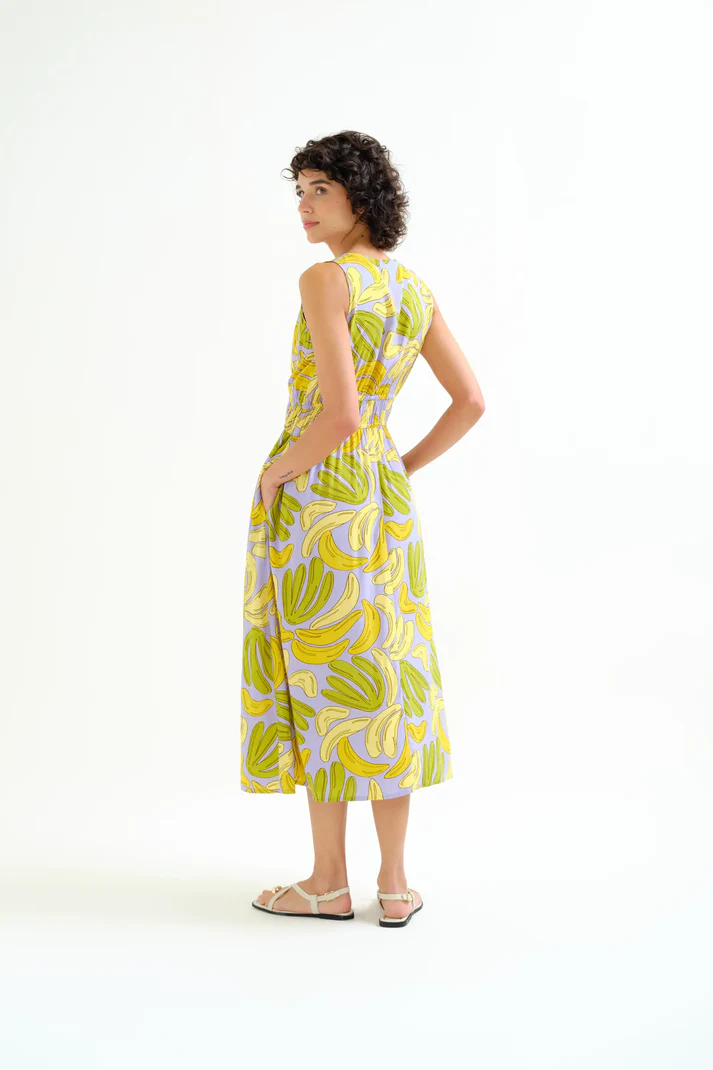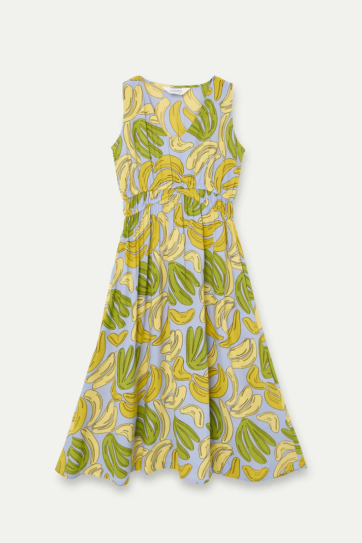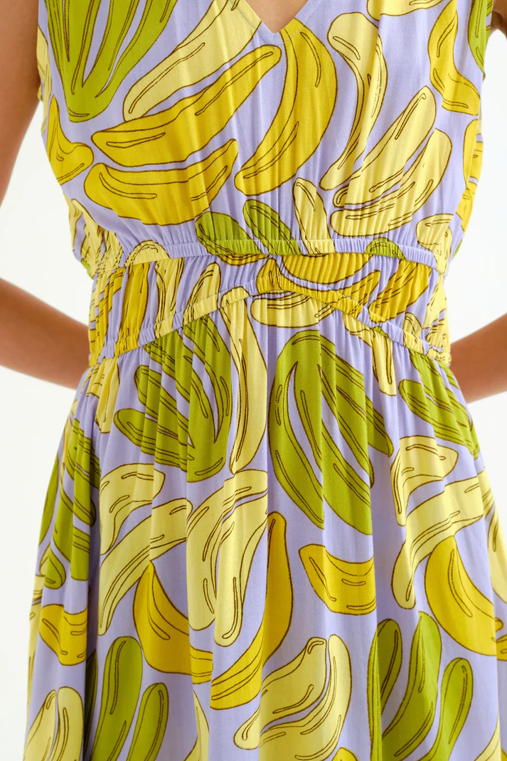 Vestido midi de tejido estampado guineo. Escote pico y sin mangas. Detalle en cintura elástica. Bolsillos laterales. La modelo mide 175 cm y lleva la talla S.