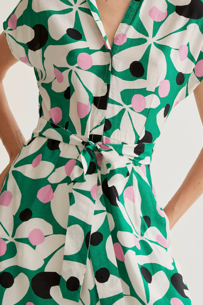 Vestido largo de tejido crepé ligero con estampado hosta. Cuello solapa y escote pico. Manga corta. Cierre frontal con botones blancos. Cintura lazada. Bolsillos laterales.Forro interior. La modelo mide 177 cm y lleva la talla S.
