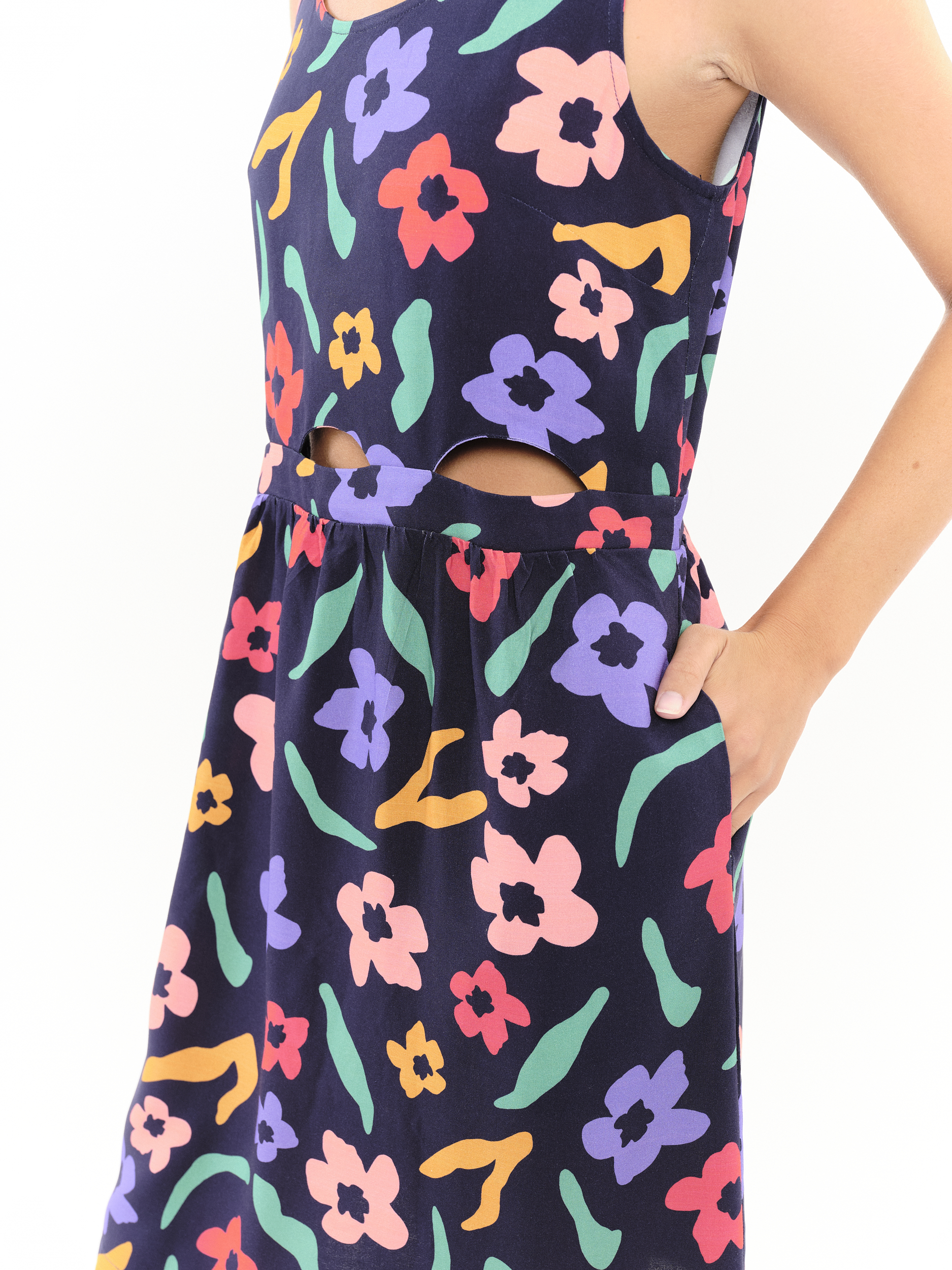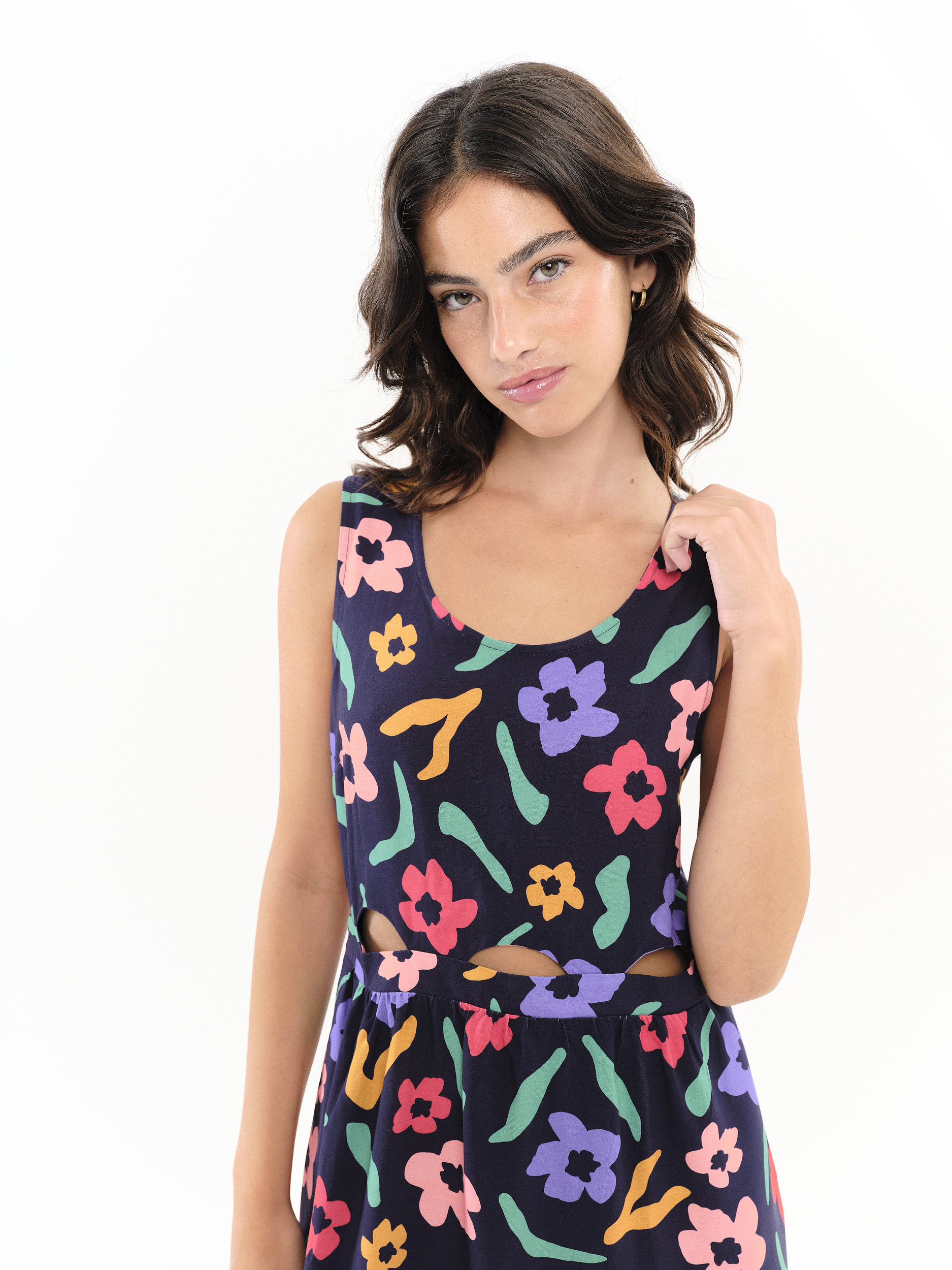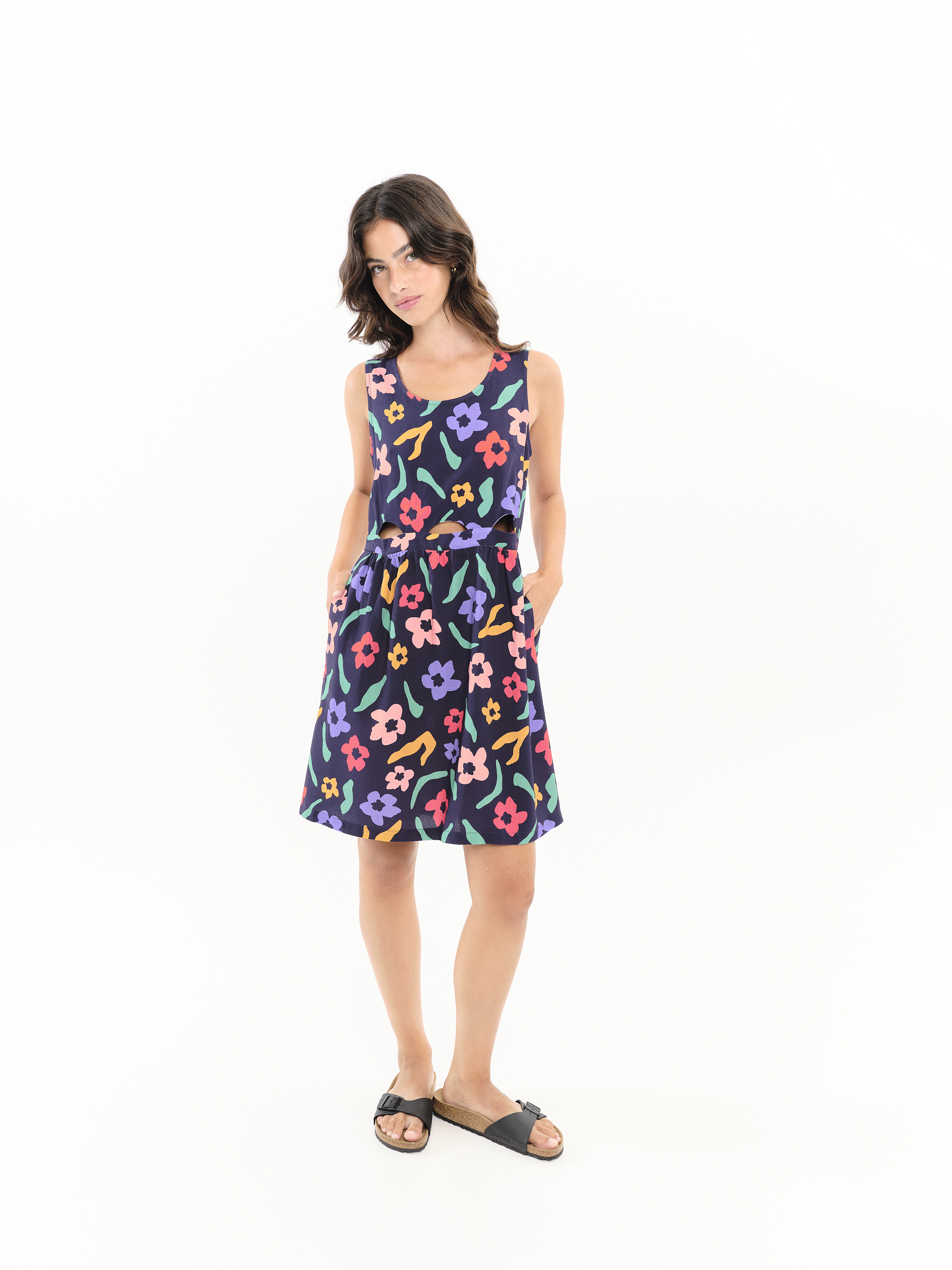 Vestido corto con cutouts en forma de onda. Espalda escotada con botones. La modelo lleva la talla S.