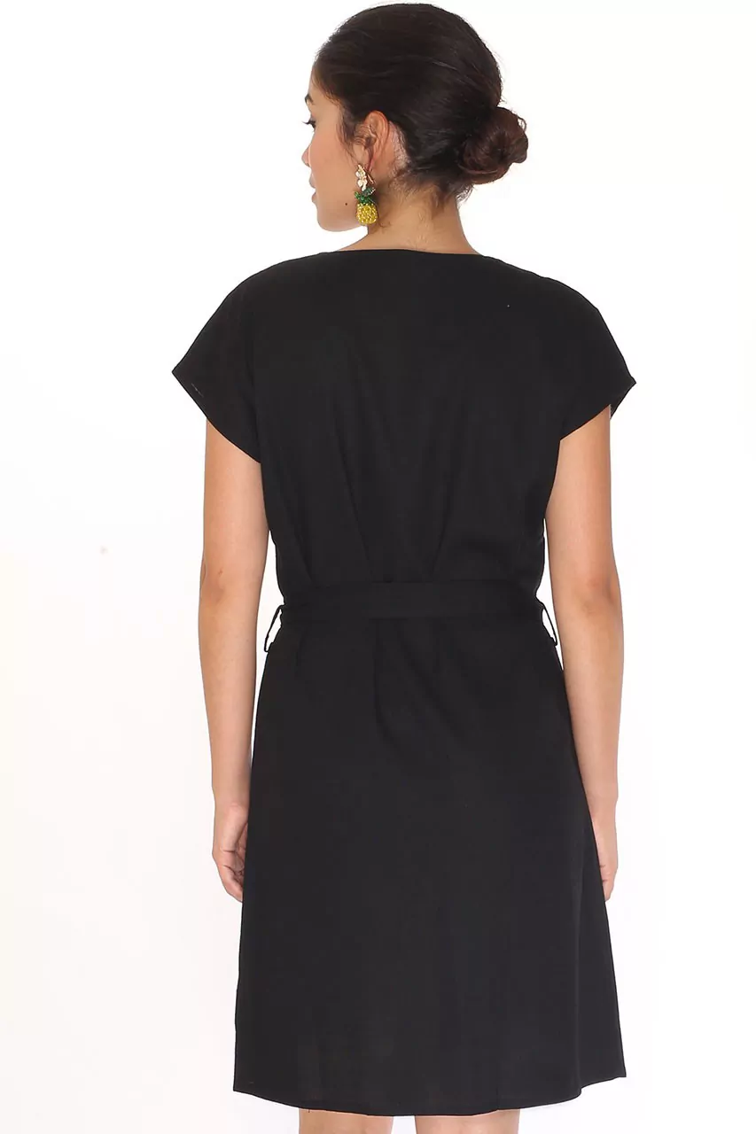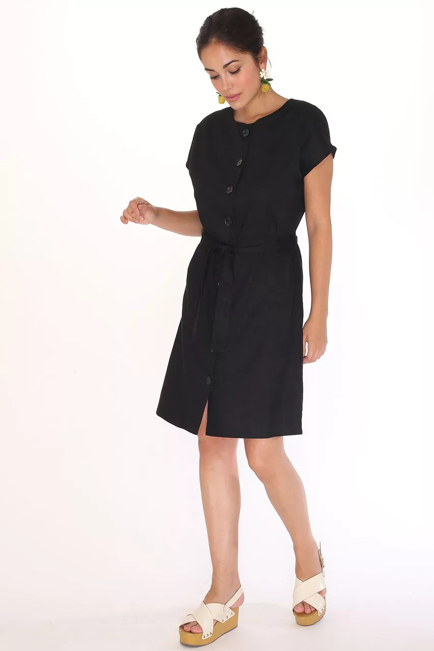 Vestido con botones en color negro, lazo para atar en la cintura, manga caída y largo por encima de las rodillas.