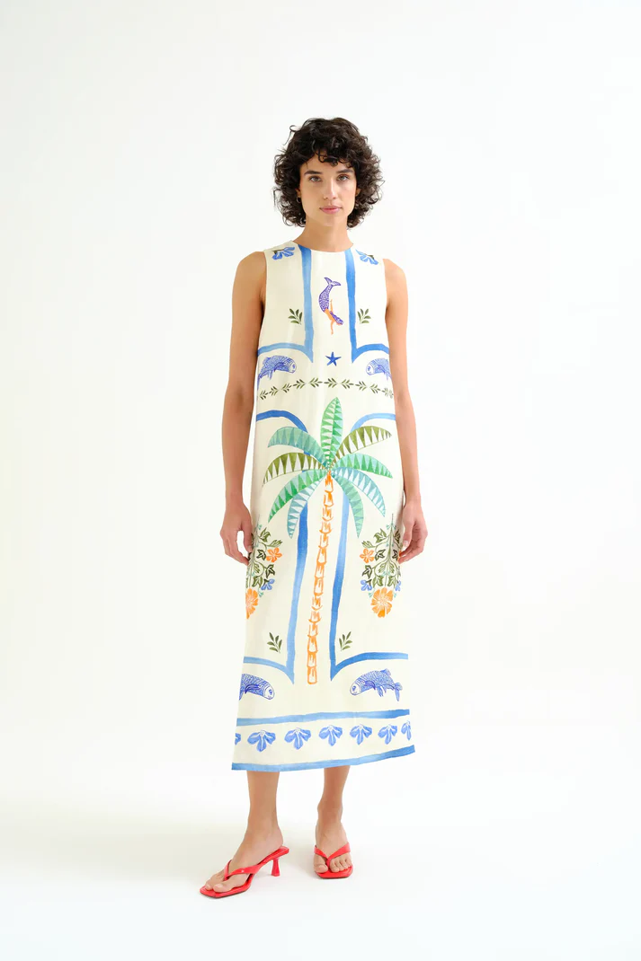 Vestido largo de tejido de crepé con estampado palm & mermaid. Cuello redondo y sin mangas. Corte fluído.Forro interior. La modelo mide 175 cm y lleva la talla S.