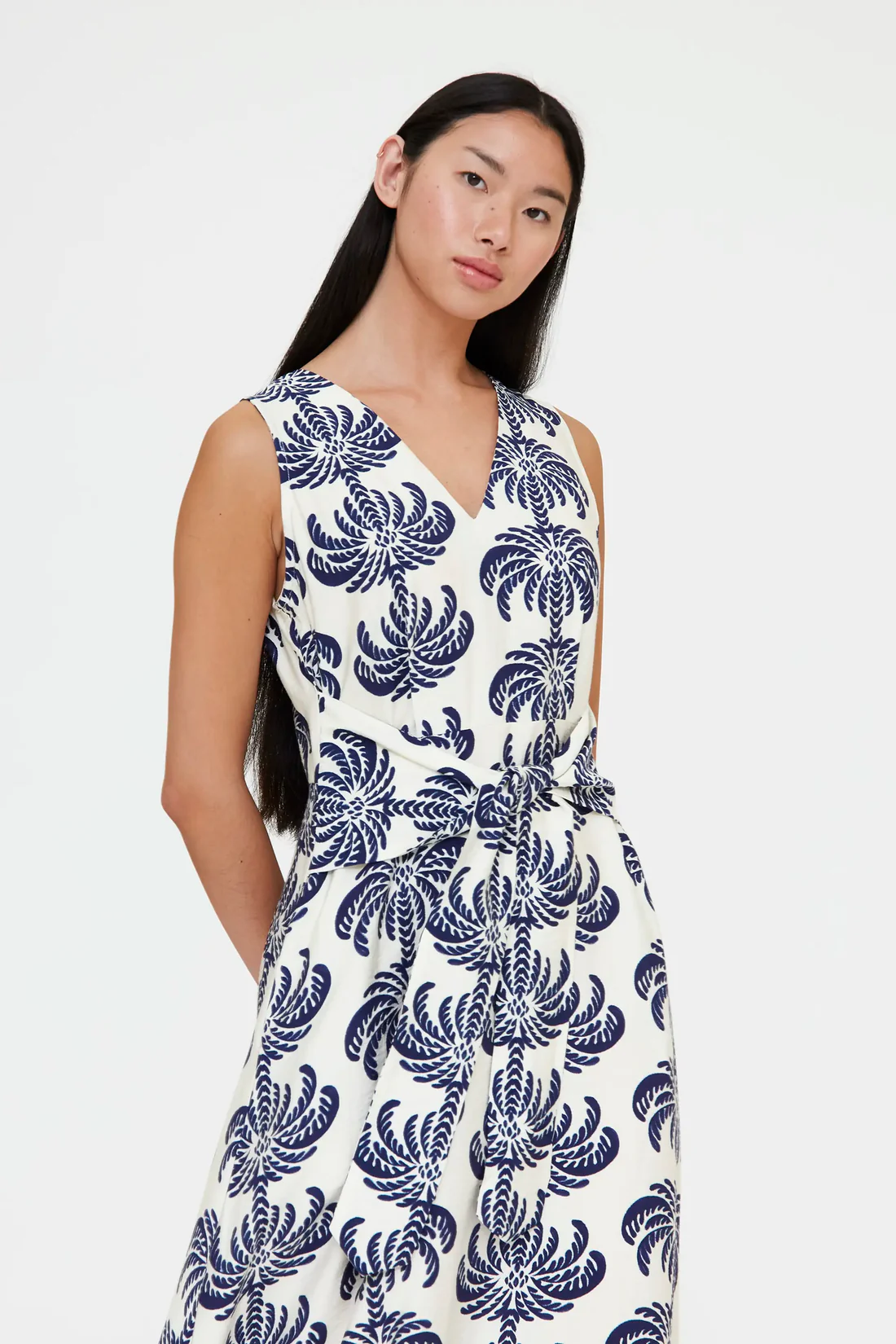 Vestido midi con tejido crepé de estampado palms spring. Con escote pico y sin mangas. Cintura lazada. La modelo mide 173 cm y lleva la talla S.