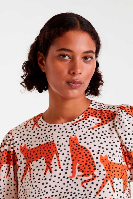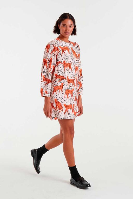 Vestido corto de tejido crepé ligero con estampado Tano. Con cuello rendondo y manga larga terminada en puño con botón. Cierre trasero con abertura y botón. Forro interior.La modelo mide 175 cm y lleva la talla S.