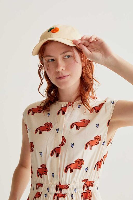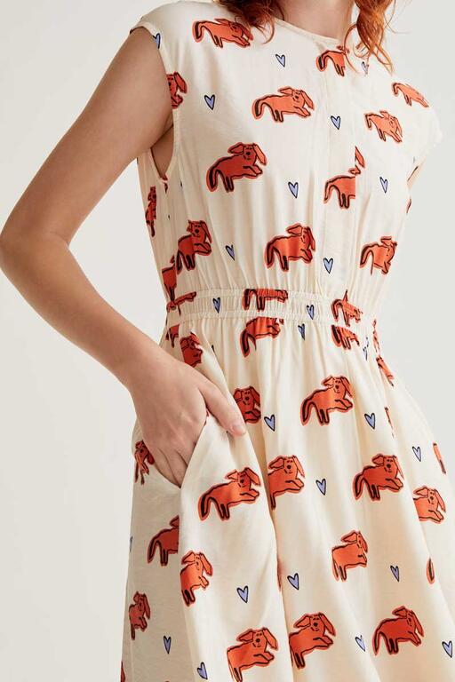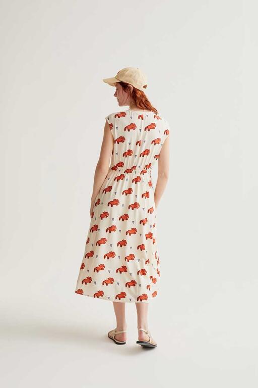 Vestido midi con tejido crepé ligero de estampado tochi. Cuello redondo y sin mangas. Cierre frontal con botones ocultos. Cintura elástica. Bolsillos laterales. La modelo mide 175 cm y lleva la talla S.
