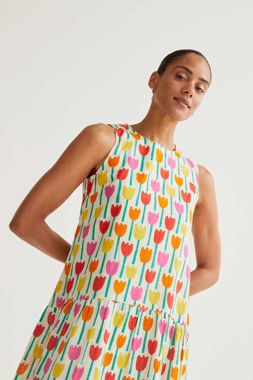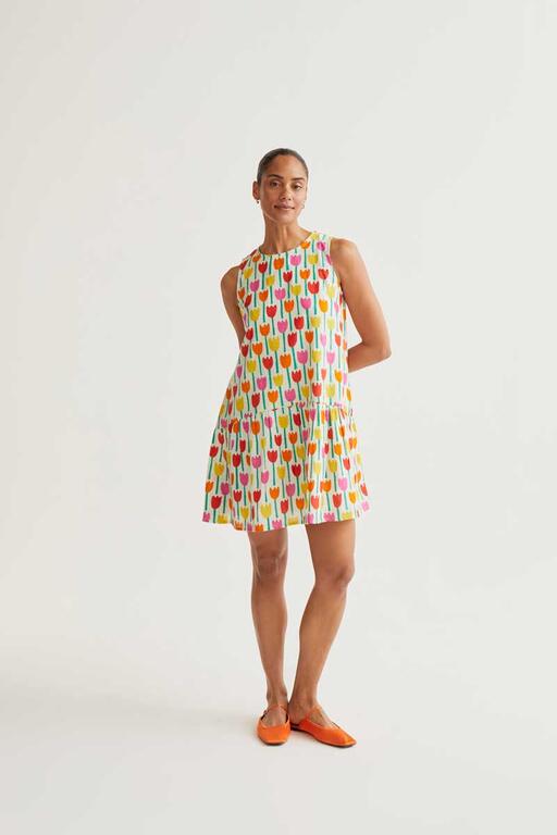 Vestido corto de tejido 100% algodón con estampado tulipa. Cuello redondo y sin mangas. Cierre posterior con botón oculto. Detalle en falda. Corte fluído.Forro interior.La modelo mide 173 cm y lleva la talla S.